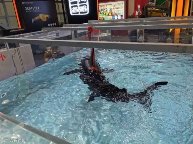 一只黑色的鲨鱼在浴缸里不断甩着尾鳍,这是博雅工道研发的ROBK-SHARK智能仿生鲨鱼无人潜水器,也是工业级水下鱼型机器人平台。它是以鲨鱼为原型,采用三关节仿生尾鳍作为唯一动力源,代替传统螺旋桨推进器,且配有110°广角、16倍光学变焦星光级摄像头。内部设备采用整体开放局部密封的结构设计,外壳采用薄膜震动型吸声结构,能够实现水下低噪音工作,从而大大提高设备的隐蔽性。