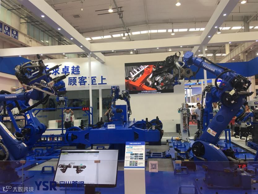 在A馆中有一个蓝色的大块头,他们互相协作有条不紊的工作,这是安川首钢展出智能化机器人焊接生产线,它可以应用于锂电池、车身、钣金、车门、地盘、车桥等的焊接检测。据工作人员介绍,双机对称焊接工艺,可以减小焊接变形,使机器人以最佳的姿态完成焊接。