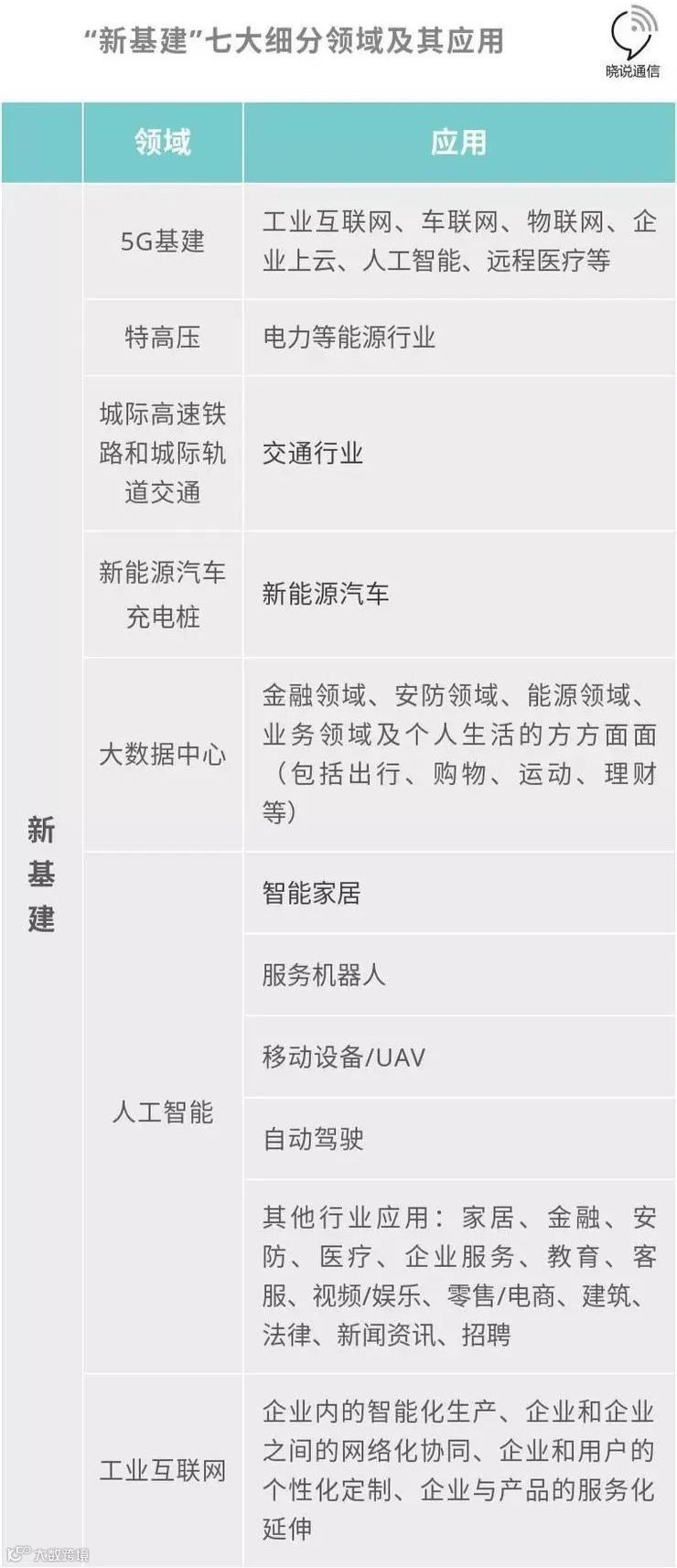 不过,在中央电视台中文国际频道的定义中,新型基础设施建设是指发力于科技端的基础设施建设,主要包含 5G 基建、特高压、城际高速铁路和城际轨道交通、新能源汽车充电桩、大数据中心、人工智能、工业互联网等七大领域,涉及到通信、电力、交通、数字等多个社会民生重点行业。
