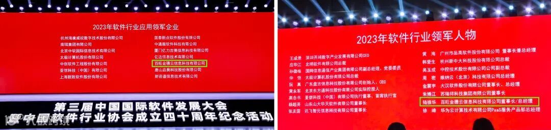 4月24日,由中国软件行业协会主办的第三届中国国际软件发展大会暨中国软件行业协会成立40周年纪念活动在北京国家会议中心隆重召开,年会高潮环节发布了一系列软件行业年度奖项,百旺金穗云荣获“2023年软件行业应用领军企业”,董事长陆振华先生荣获“2023年软件行业领军人物”称号;同时在近期河南省软件服务业协会主办的2024河南省软件创新发展论坛中,百旺金穗云荣获“2023年河南省软件和信息技术服务业知名企业”,董事长陆振华先生荣获“2023年河南省软件和信息技术服务业知名领军人物”称号。