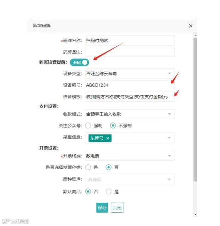 场景开票-扫码付中,新增码牌时,选择到账语音提醒,设备类型选择百旺金穗云音响,录入音响设备编号,支持自主设计语言模版。