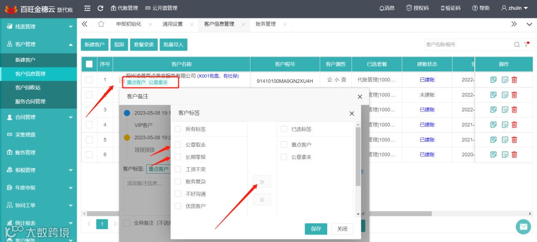 点开客户旁边的记事本--调整标签--选中标签--保存,客户标签还能自定义哦!