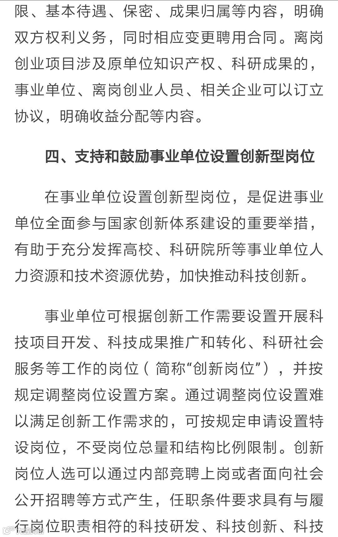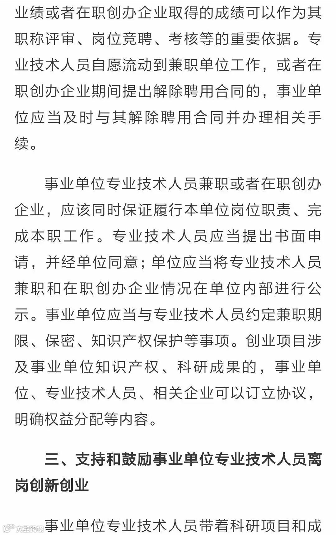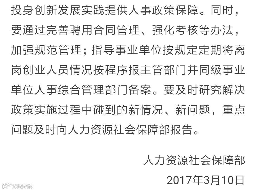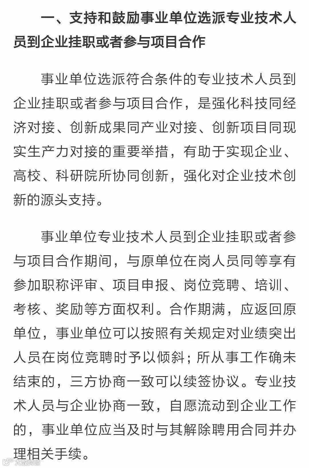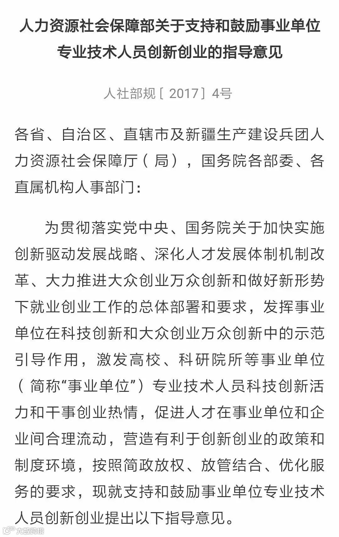 近日,人力资源和社会保障部发布了,关于支持和鼓励事业单位专业技术人员创新创业的指导意见,文件指出要发挥事业单位在科技创新与大众创业万众创新中的示范作用,激发高校、科研院所等事业单位专业技术人员科技创新活力和干事创业热情……
