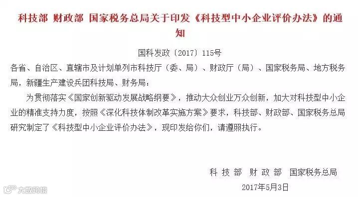 为贯彻落实《国家创新驱动发展战略纲要》,推动大众创业万众创新,加大对科技型中小企业的精准支持力度,按照《深化科技体制改革实施方案》要求,科技部、财政部、国家税务总局研究制定了《科技型中小企业评价办法》