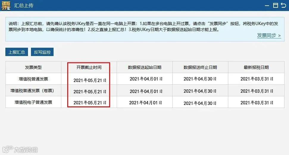 操作流程:重新打开汇总上传界面,查看各发票类型开票截止时间是否更新到下月中旬,若更新,说明操作成功。