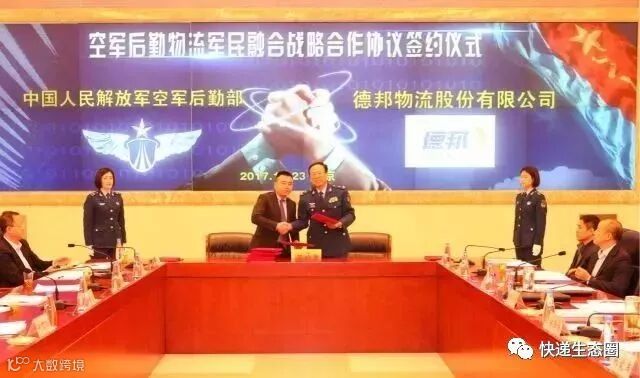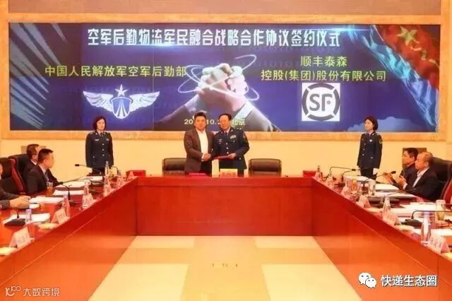 10月23日,顺丰、京东、德邦与中国人民解放军空军后勤部(以下简称空军后勤部)在京签署战略合作协议,就空军后勤军民融合军事物流体系建设开展长期合作,并颁发“空军后勤物流军民融合战略合作单位”资质牌。