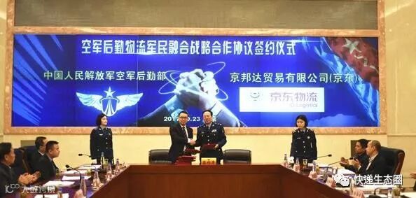 10月23日,京东物流与中国人民解放军空军后勤部达成“物流军民融合”战略合作。5年内,双方将在运输配送、仓储管理、物资采购、信息融合、科研创新、力量建设、拥军服务、配套支撑等方面展开深入合作,最终达到后勤物流“成系统、整建制、全覆盖”融合的目的,真正将军事物流打造为国民经济向空军战斗力转化的纽带。