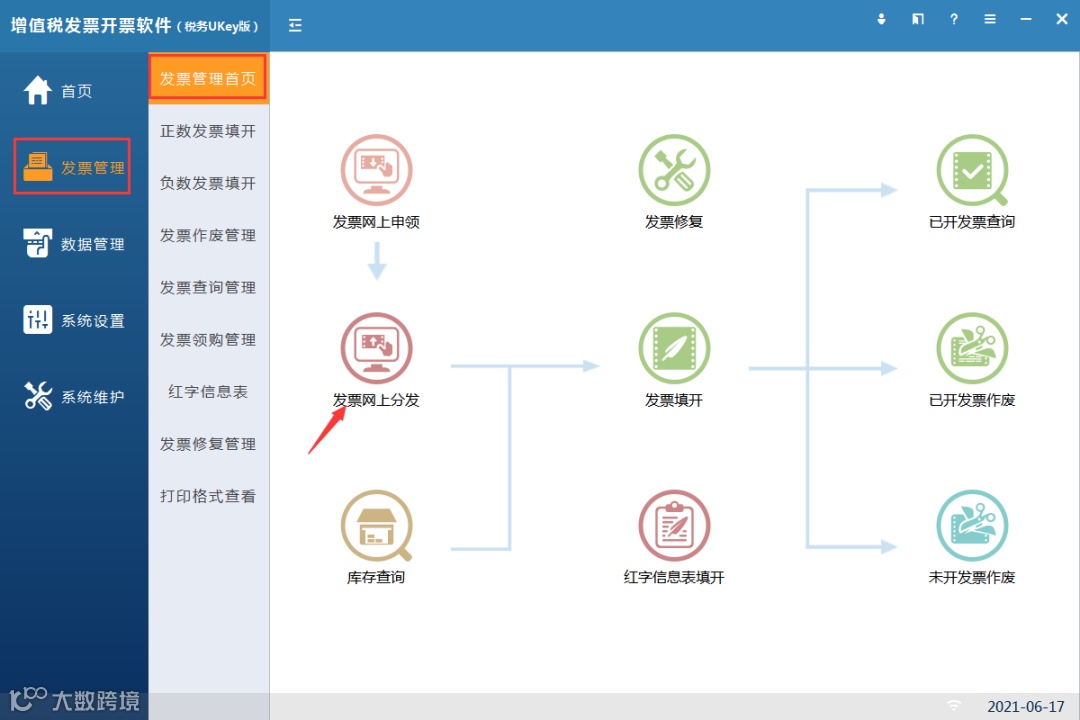 第一步:点击【发票管理】-【发票管理首页】-【发票网上分发】模板