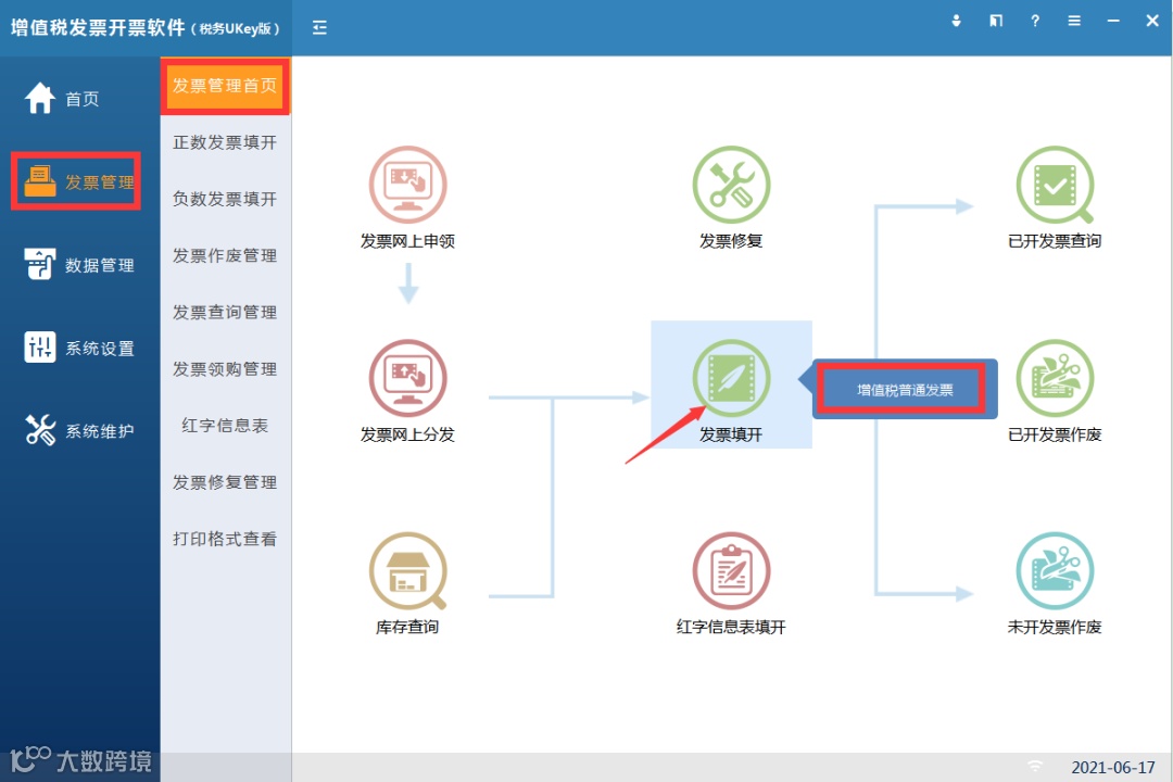 第一步:点击【发票管理】-【发票管理首页】-【发票填开】模板,单击选择对应开具的票种。