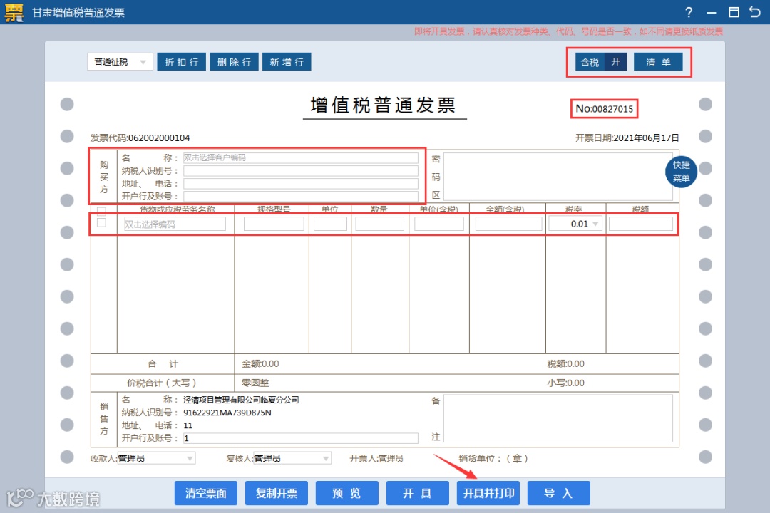 核对发票页面右上角含税标识,是否切换成开