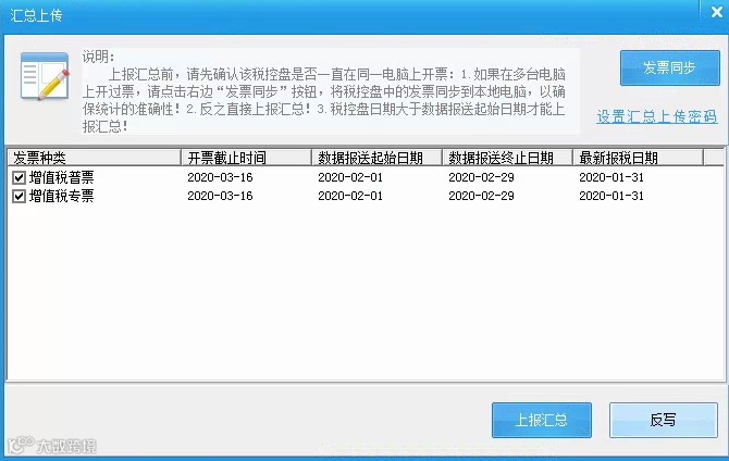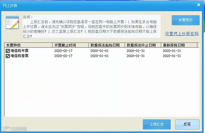 答:点击【确定】,退出网上抄报的界面,重新登录进入网上抄报界面查看开票截止时间是否更新到下个月中旬,如果是,表示已经抄报成功,不需要再重复点击【反写】。如果没有更新,需要重新点击【上报汇总】,然后点击【反写】即可。