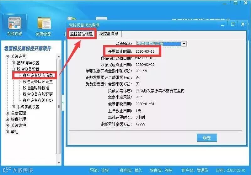 操作流程:【报税处理】-【状态查询】-监控管理信息列表,查看各发票种类“开票截止时间”是否更新至2020年3月16日。