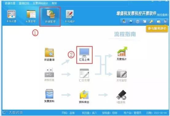 操作流程:【数据管理】-【汇总上传】-【上报汇总】(月初打开软件,在网络通畅的情况下,开票软件会自动上报汇总。)