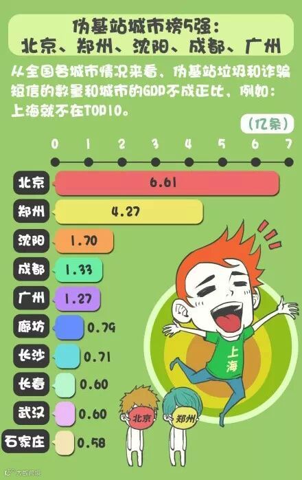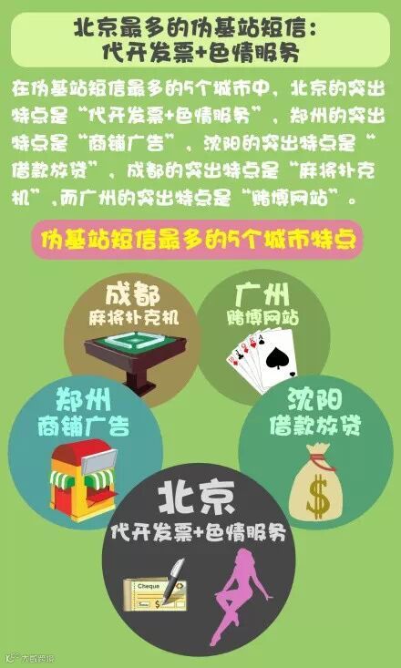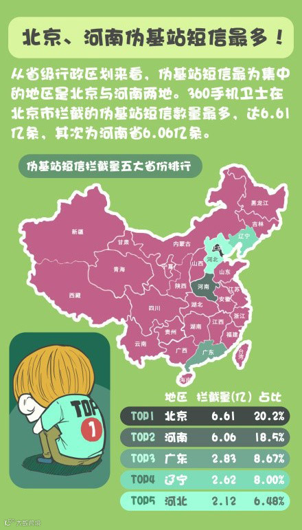 近日,360发布《2014年中国伪基站短信治理报告》显示,从省级行政区划来看,伪基站短信最为集中的地区是北京与河南两地。从全国各城市情况来看,伪基站短信拦截量仅次于北京的是郑州,三至十名分别为:沈阳、成都、广州、廊坊、长沙、长春、武汉、石家庄。