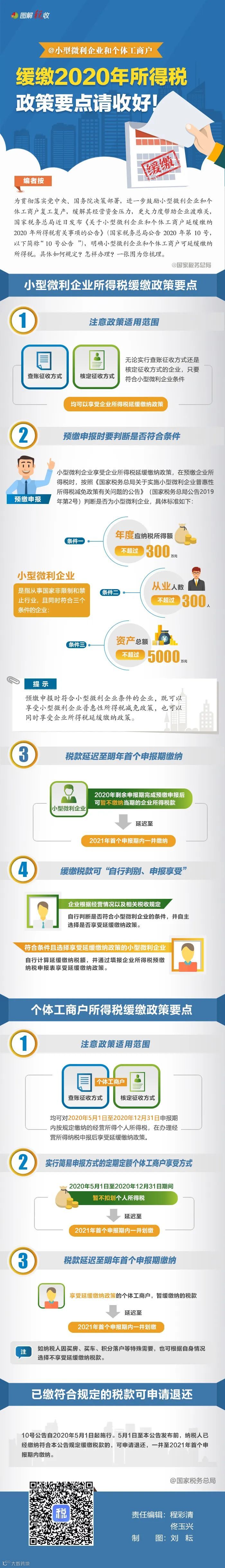 为贯彻落实党中央、国务院决策部署,进一步鼓励小型微利企业和个体工商户复工复产,缓解其经营资金压力,更大力度帮助企业渡难关,国家税务总局近日发布《国家税务总局关于小型微利企业和个体工商户延缓缴纳2020年所得税有关事项的公告》(国家税务总局公告2020年第10号),明确小型微利企业和个体工商户可延缓缴纳所得税。具体如何规定?怎样办理?一张图为你梳理。