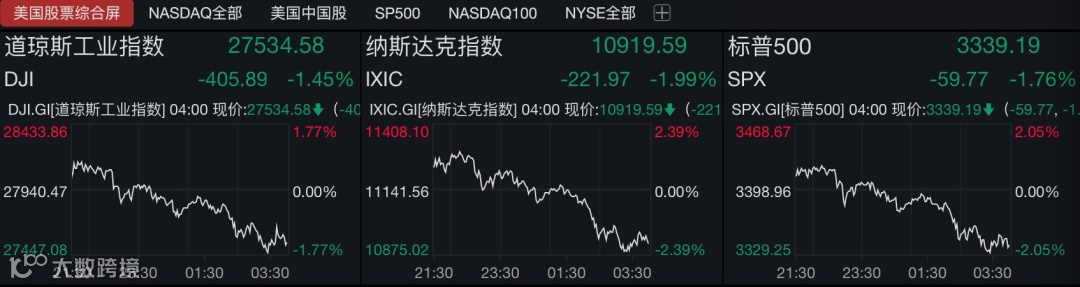 据Wind数据,截至收盘,道琼斯工业指数跌1.45%,报27534.58点;纳斯达克指数跌1.99%,报10919.59点;标普500指数跌1.76%,报3339.19点。