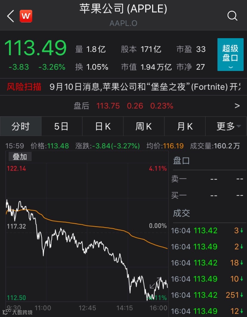 科技股再度成为引领大盘走势的主要力量。美国大型科技股全线走低,其中苹果跌3.26%,总市值单日蒸发654.93亿美元(约合人民币4475亿元)至1.94万亿美元,再度跌破2万亿美元。
