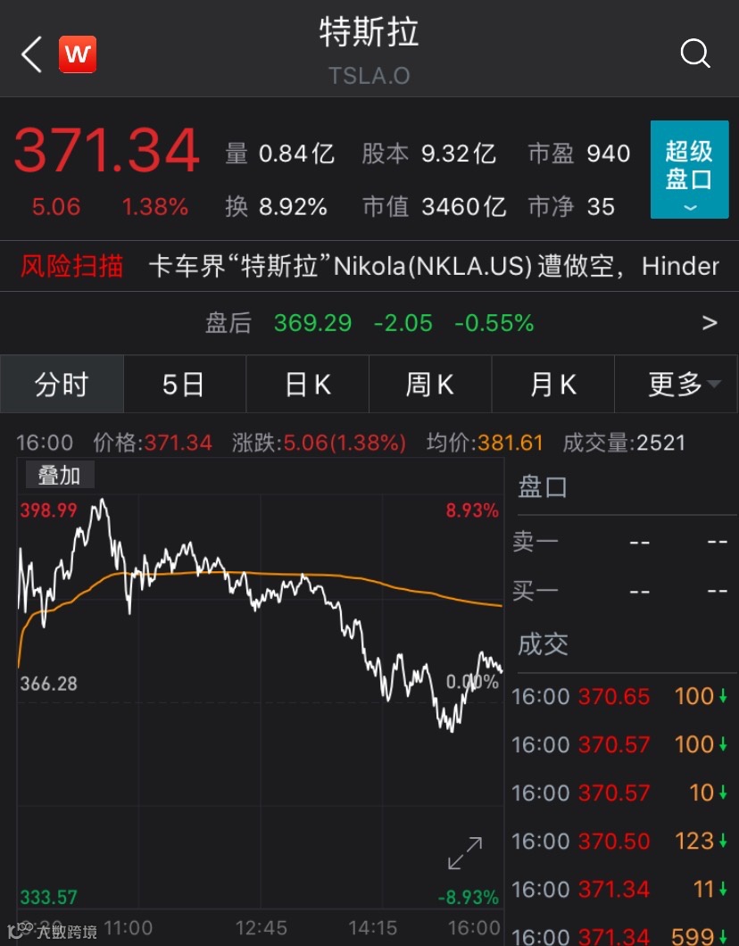 另外,特斯拉冲高回落,尾盘小幅拉升,收盘时上涨1.38%,股价站上370美元,报371.34美元。