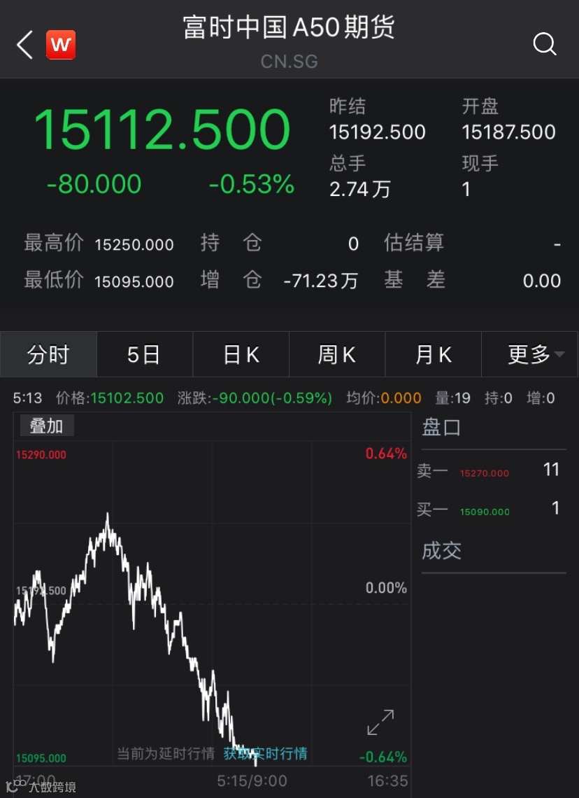 尽管受市场风险偏好回落影响,富时中国A50指数期货夜盘冲高后回落,但下跌幅度明显小于美股三大指数。据Wind数据,富时中国A50指数期货主力合约夜盘收跌0.53%。