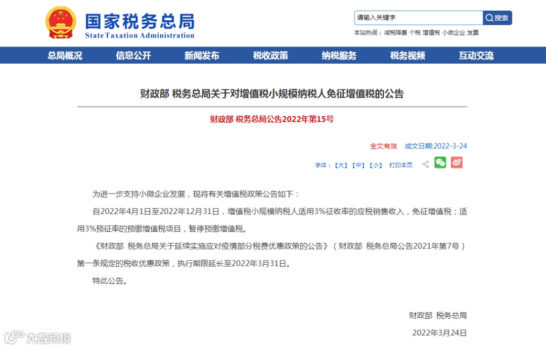 国家税务总局为进一步支持小微企业发展,下发《关于对增值税小规模纳税人免征增值税的公告》(财政部税务总局公告2022年第15号)。