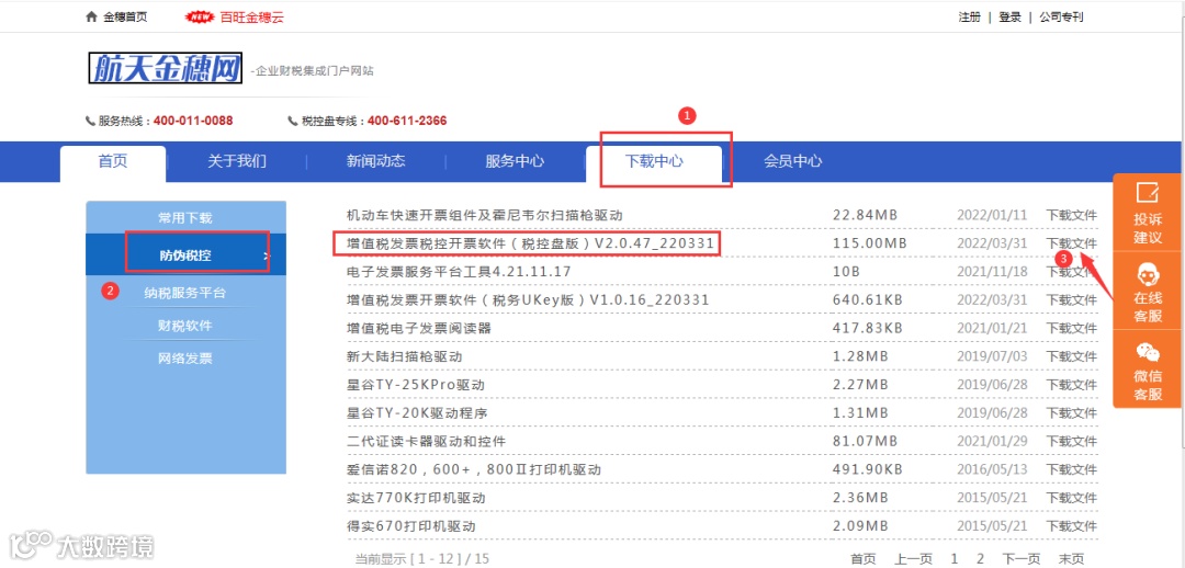 登录航天金穗网www.htjs.net点击下载中心-常用下载-选择“增值税发票税控开票软件(税控盘版)V2.0.47”进行下载,根据步骤提示完成安装即可。