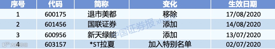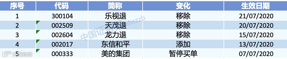 MSCI之外,根据港交所信息披露,7月以来,沪股通、深股通也调整了成分股名单。乐视退、天茂退、龙力退、退市美都被移除,国联证券、新天绿能、东信和平被添加,*ST拉夏被加入特别名单,美的集团则被暂停买单。