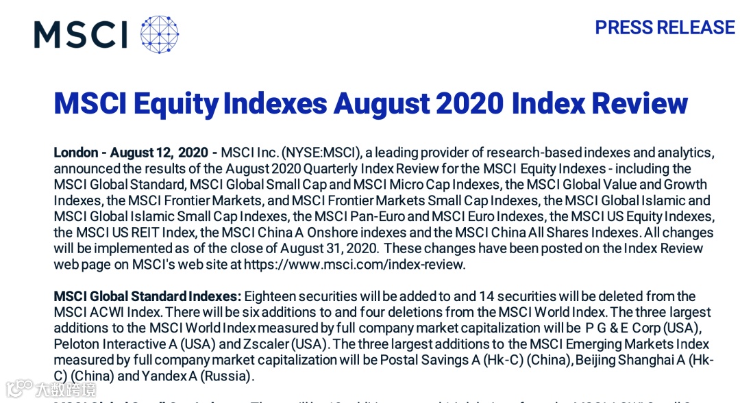 MSCI中国指数为MSCI新兴市场指数的一部分,这意味着跟随MSCI新兴市场指数的巨量资金将随着指数调整买入、卖出上述股票。此外,MSCI也对MSCI中国A股在岸指数、MSCI中国全指数进行了调整,不过由于跟随这些指数的海外资金总量较小,调整带来的资金流入对相关个股影响较小。