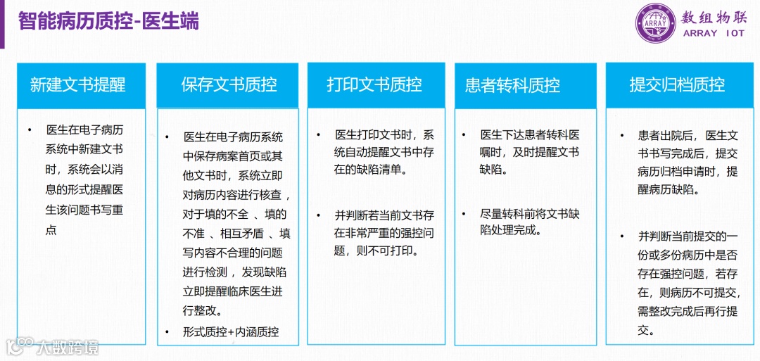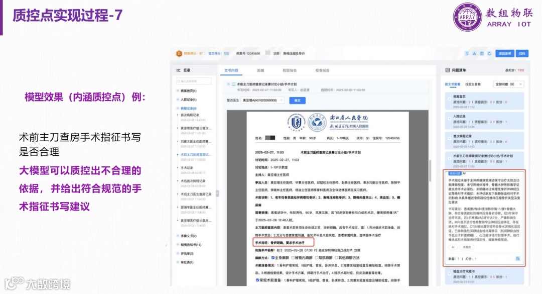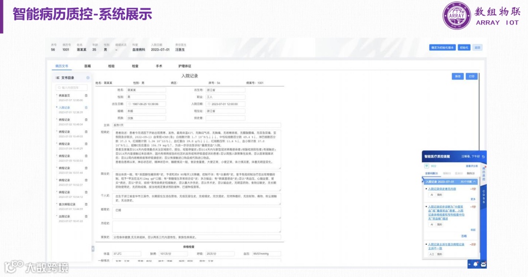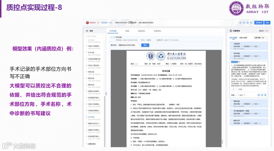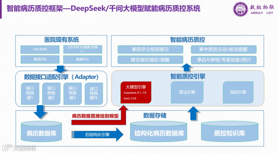 数组智能病历质控框架:通过集成医院现有系统、数据接口适配、大模型引擎和智能质控引擎,实现了病历数据的智能化处理和质控。通过事前、事中、事后的质控提醒和审核,提高了病历填写的准确性和质量。