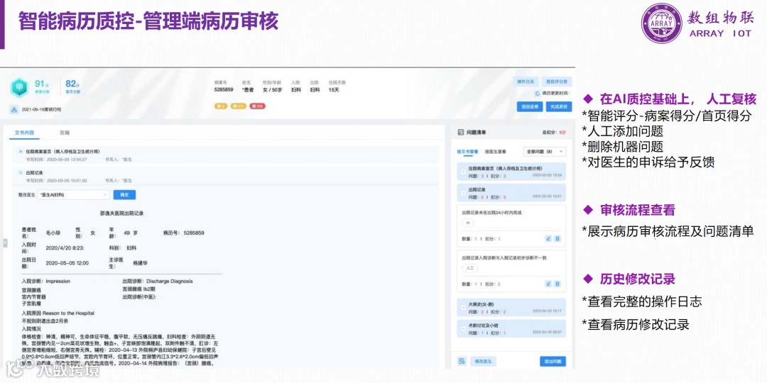 • 在AI质控基础上,进行人工复核,确保病历得分和首页得分的准确性。