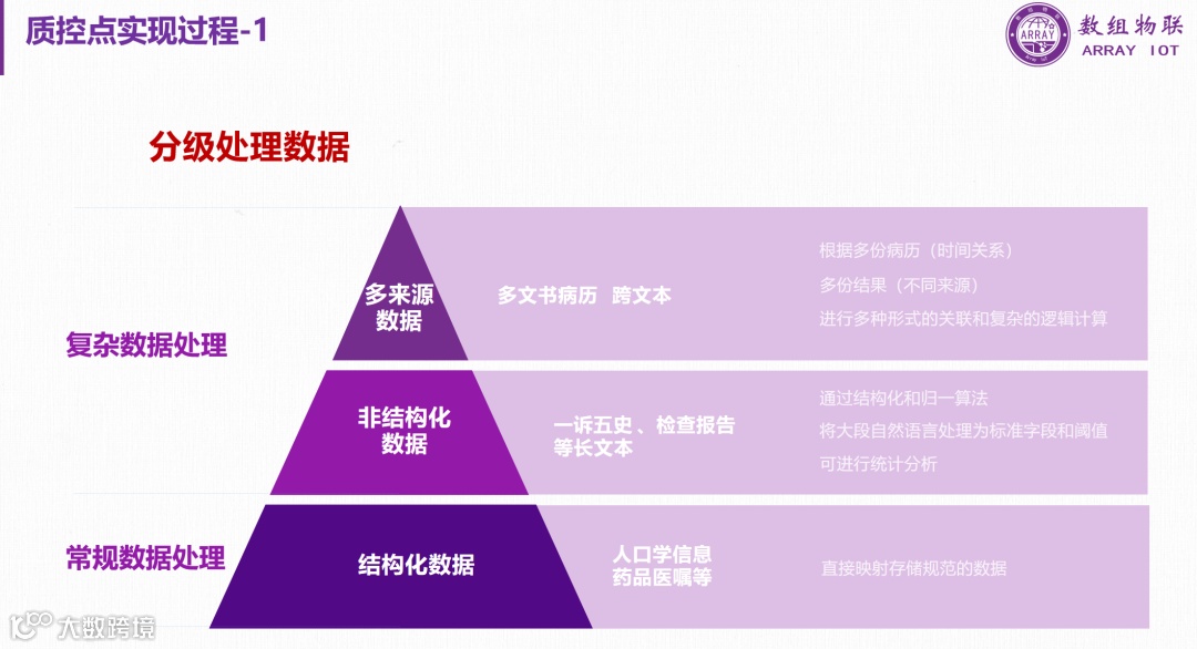 其次是复杂数据处理,针对非结构化数据,例如病历和检查报告,需要通过结构化和归一算法将自然语言转化为标准字段和阈值进行统计分析;