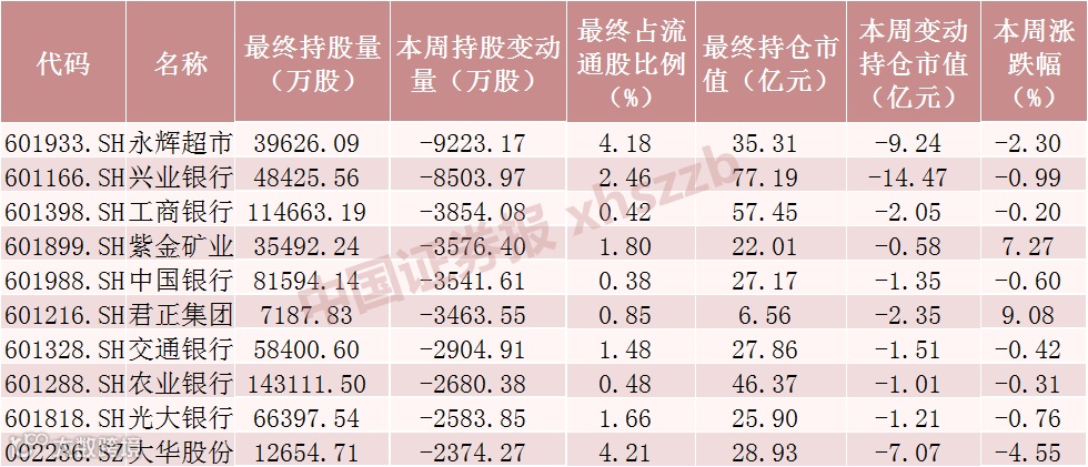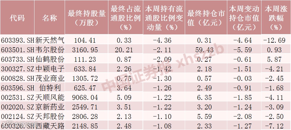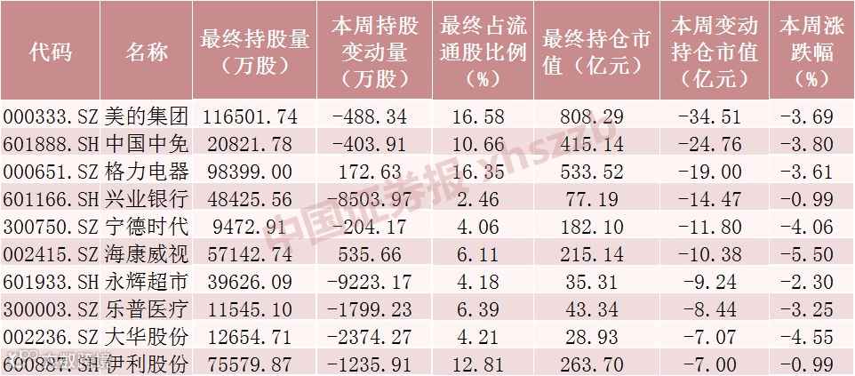 本周北向资金减仓股数居前个股