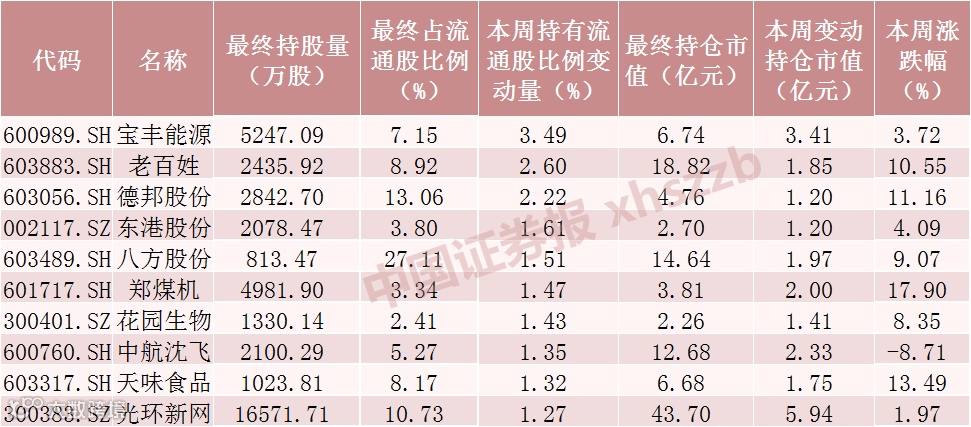 从持有流通股比例情况来看,Choice数据显示,本周北向资金对12只个股的持有流通股比例增加1个百分点以上,其中对宝丰能源持有流通股比例增加3.49个百分点,对老百姓、德邦股份的持有流通股比例增加超过2个百分点。