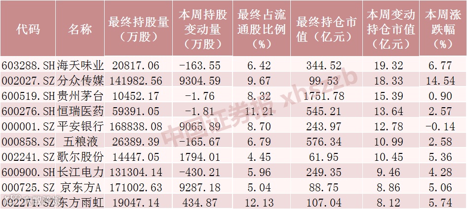 本周北向资金加仓股数居前个股