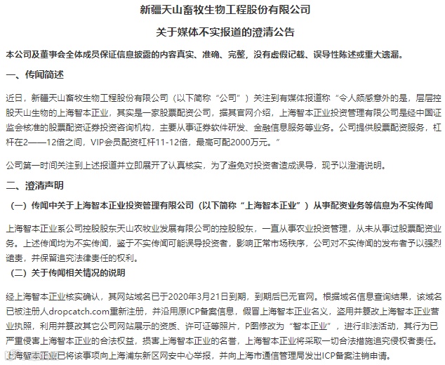9月11日午间盘后,热门股天山生物就媒体报道控股股东天山牧业的控股股东智本正业涉及场外配资一事发布澄清公告称,智本正业一直从事农业投资管理,从未从事过股票配资业务,上述传闻均为不实传闻。目前该股处于停牌状态。