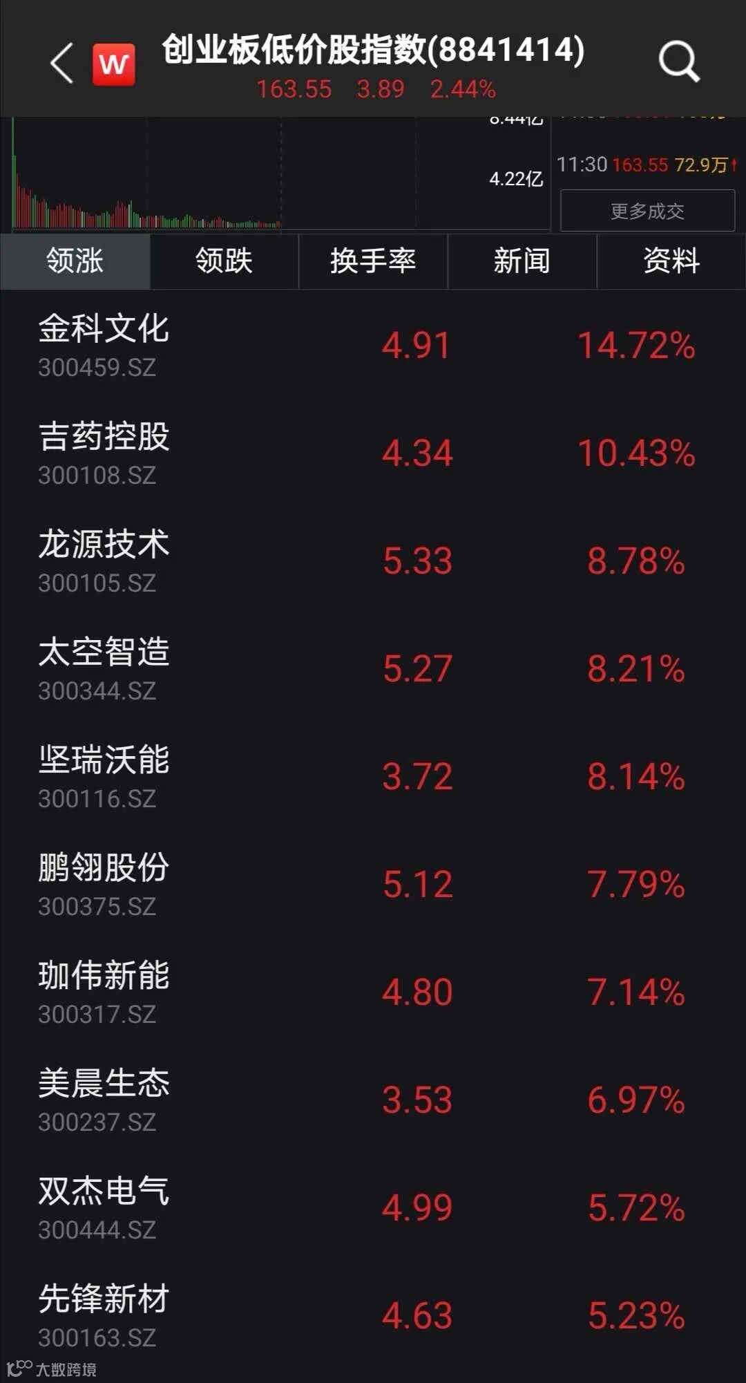 上午,创业板低价股指数涨超2%,盘初一度跌超3%,坚瑞沃能、金科文化、吉药控股等涨超7%。