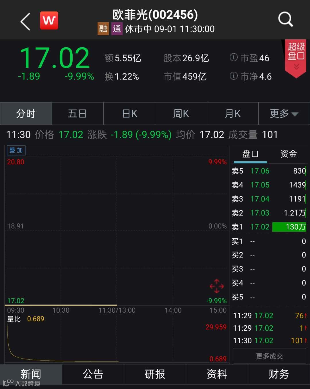 今日早盘,欧菲光一字跌停。Wind数据显示,截至午间收盘,欧菲光报17.02元,成交32.58万手,成交额5.55亿元,换手率为1.22%。卖一上有130万手卖单,价值约22.13亿元。