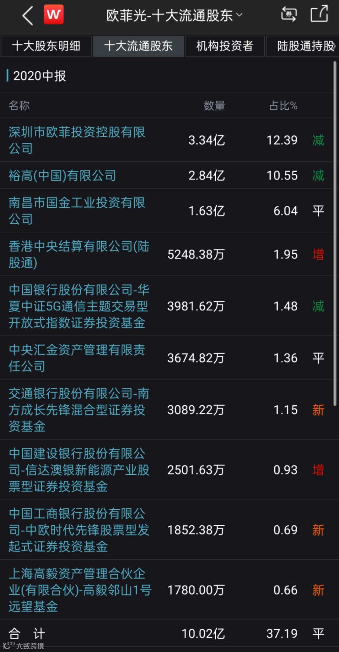 半年报显示,截至上半年末,欧菲光十大流通股东中,香港中央结算有限公司持有5248.38万股,中国银行股份有限公司-华夏中证5G通信主题交易型开放式指数证券投资基金持有3981.62万股、中央汇金资产管理有限责任公司3674.83万股、上海高毅资产管理合伙企业(有限合伙)-高毅邻山1号远望基金持有1780万股。