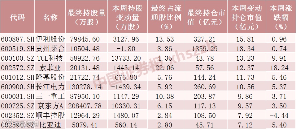 从持仓市值变动情况来看,Choice数据显示,本周北向资金对6只股票的持仓市值增加超过10亿元,分别为伊利股份、贵州茅台、TCL科技、索菲亚、隆基股份、长江电力。在本周北向资金持仓市值增加额前十个股中,仅有顺丰控股本周累计下跌,其他9只个股本周均累计上涨,而北向资金本周仅对贵州茅台和长江电力减仓,对其他8只个股均加仓。
