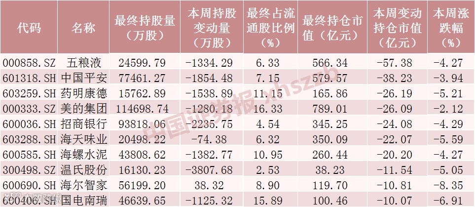 本周A股市场连续震荡调整,上证指数、深证成指、创业板指分别累计下跌1.42%、1.41%、0.93%。Choice数据显示,本周北向资金连续5个交易日合计净流出222.62亿元,创近六周单周净流出新高,其中沪股通资金净流出134.16亿元,深股通资金净流出88.46亿元。本周北向资金对888只股票减仓,对582只股票加仓。