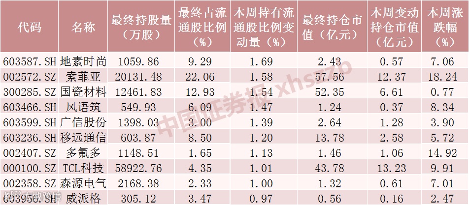 从持有流通股比例情况来看,Choice数据显示,本周北向资金对9只股票的持有流通股比例增加1%以上,其中对地素时尚、索菲亚、国瓷材料的持有流通股比例增加超过1.5%。