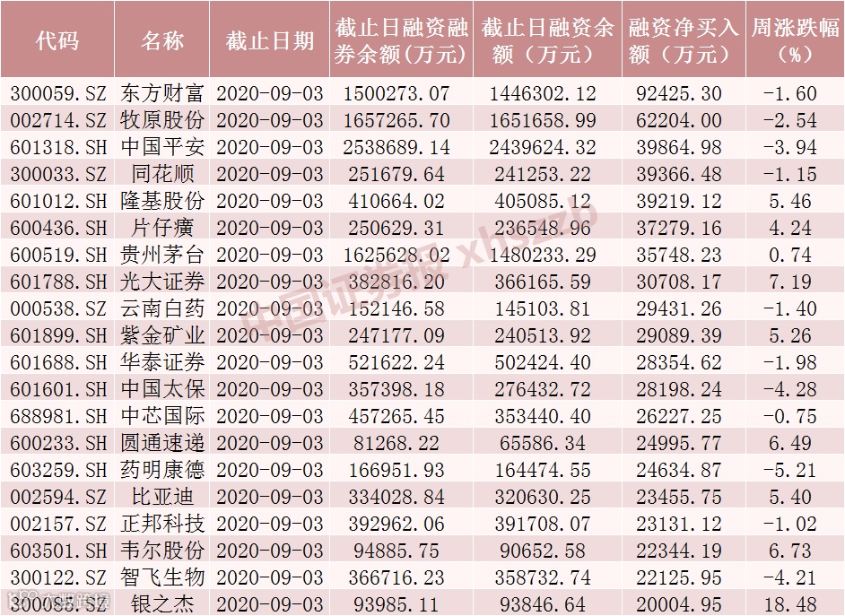 从个股情况来看,Choice数据显示,截至9月3日,本周前四个交易日两市共有1029只股票获得融资净买入,其中69只个股融资净买入金额超过1亿元。在融资净买入金额排名前20的股票中,东方财富、牧原股份、中国平安、同花顺、隆基股份、片仔癀、贵州茅台、光大证券融资净买入金额超3亿元,分别达9.24亿元、6.22亿元、3.99亿元、3.94亿元、3.92亿元、3.73亿元、3.57亿元、3.07亿元,但从本周涨跌幅情况来看,融资客加仓额位居前四的股票本周均累计下跌,表明在本周市场调整之下,本周融资客加仓效果并不理想,不少加仓股票陷入浮亏。