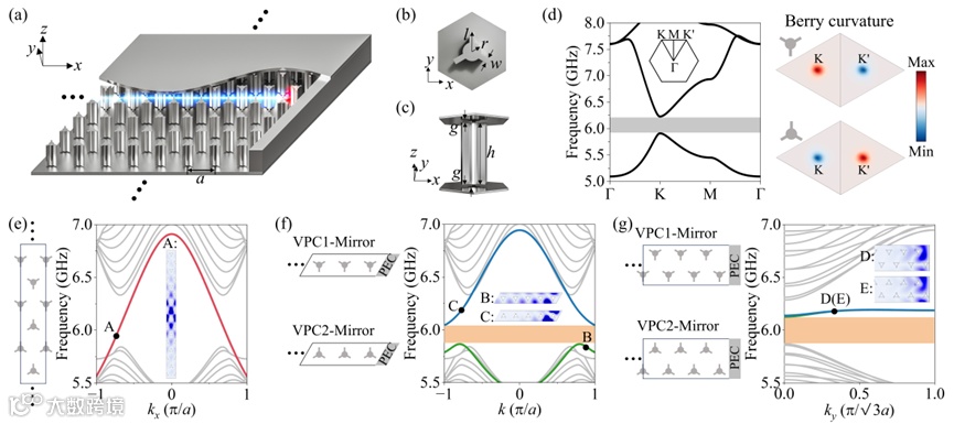 图1 (a)拓扑光子晶体微腔示意图,由两个谷陈数相反的VPCs和放置在VPC波导末端的金属反射镜组成。(b) VPC单元格的俯视图和(c)侧视图。金属三脚架对称地夹在两个平行金属板之间,内半径r = 3.68mm,臂长l = 7.95mm,臂宽w = 2.21mm,三脚架高h = 34.6mm,空气间隙g = 1.1mm晶格常数为a = 36.8mm。(d)VPC的能带结构(左图)和Berry曲率(右图)。插图显示了第一个布里渊区。(e)两个谷陈数相反的VPCs形成的VPC波导的超胞结构及其色散关系。(f)两个VPCs 与锯齿形放置PEC界面的超胞结构和色散关系。(g)两个VPCs 与扶手形放置PEC界面的超胞结构和色散关系。插图显示了特征模A、B、C、D和E的电场分布。
