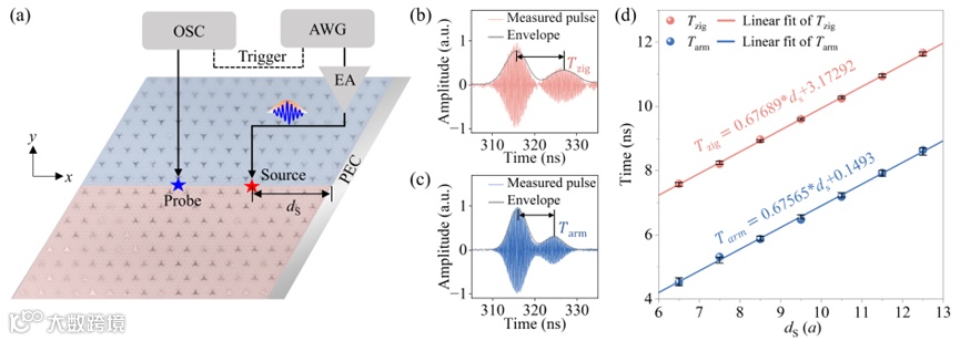 最后,我们进行了时域脉冲测量来直接提取镜面上的反射延迟时间。图3(b)和图3(c)分别给出了锯齿形和扶手形端部的测量脉冲信号。在每个周期中,我们观察到两个脉冲峰值。第一个峰值对应于源激发的直接传输脉冲信号,第二个峰值对应于右侧金属反射镜反射的脉冲信号。两个脉冲峰值之间的时间差T可以由T = 2dS/vg+tr给出,其中dS为脉冲源(红色星星)与金属镜面之间的距离,vg为谷边态的群速度,tr为谷间翻转的延迟时间。通过改变源位置,我们测量了锯齿形(红色球体)和扶手形(蓝色球体)端点的两个脉冲峰之间的时间差ds,如图3(d)所示。通过对实测结果进行线性拟合,分别从斜率提取谷边界态的群速度vg,从拟合线截距提取谷翻转时间tr。测量到的之锯齿和扶手的群速度分别为0.362c和0.363c,与5.9 GHz时的0.4c的模拟群速度几乎相同。此外,锯齿形端部和扶手椅端部的谷翻转时间分别为trzig = 3.17±0.06 ns和trarm = 0.15±0.12 ns,验证了锯齿形的谷翻转率远低于扶手形的谷翻转率。在之字形末端延迟的谷翻转时间比光子通过晶格常数传播所需的时间要长得多(a/vg = 0.34 ns)。结果表明,电磁能量在端部反射镜附近被强烈局域化,在反射镜表面附近可以得到一个高品质因子为Qzig = πftrzig = 58.75±1.11,频率为f = 5.9 GHz的亚波长拓扑控制光子腔。相反,对于扶手椅终端,谷翻转时间与光子通过晶格常数所需的时间数量级相同,因此电磁能量不能被严格限制在扶手椅终端附近,并且拓扑光子晶体微腔在频率f = 5.9 GHz处表现出低品质因子Qarm = πftrarm =2.78±2.22。