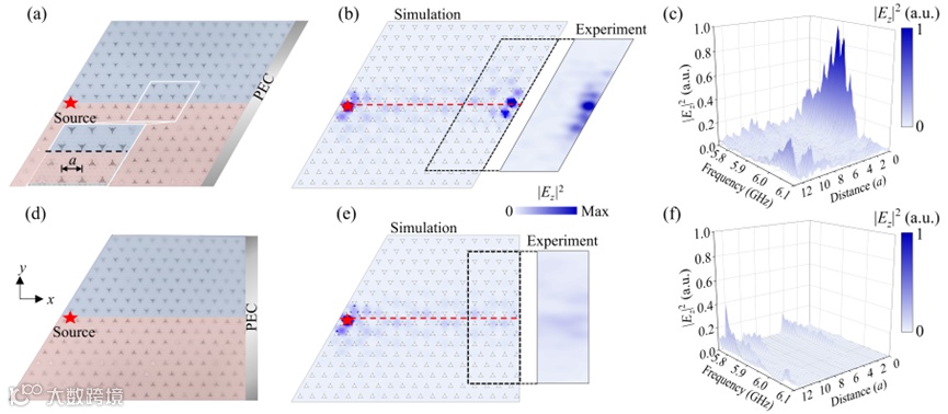 图2 (a), (d)锯齿形和扶手形拓扑光子晶体微腔俯视图。(b), (e)模拟和测量的5.90 GHz时锯齿形和扶手形拓扑光子晶体微腔的电场分布。(c), (f)不同频率锯齿形和扶手形拓扑光子晶体微腔沿畴壁(红色虚线)测量的电场强度。