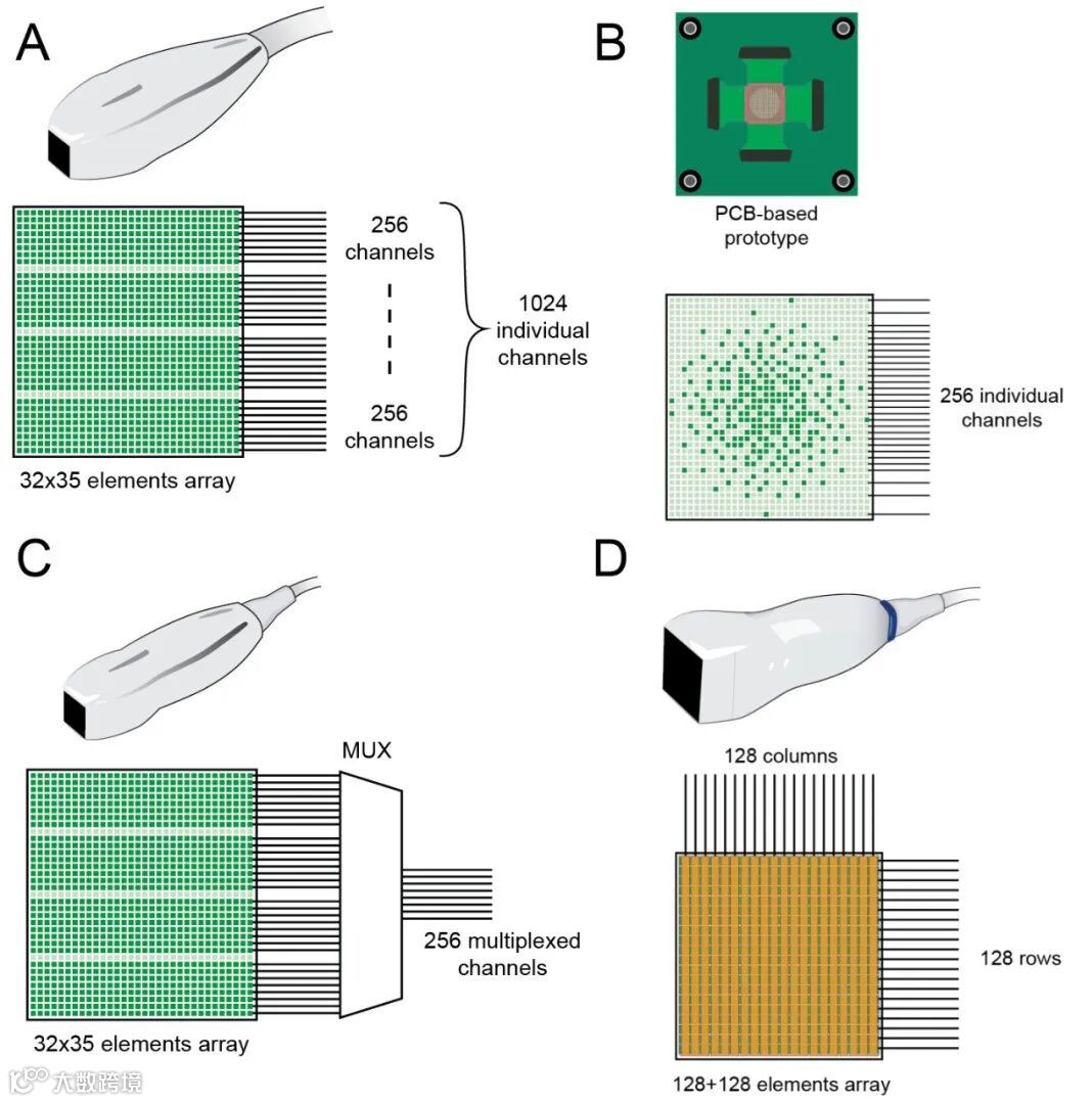 图2 常见的容积ULM超声系统。A 1024千通道级矩阵探头;B. 稀疏阵列系统。C.带多路复用系统的矩阵探头。D.行列阵(Row-column addressed array, RCA)探头。