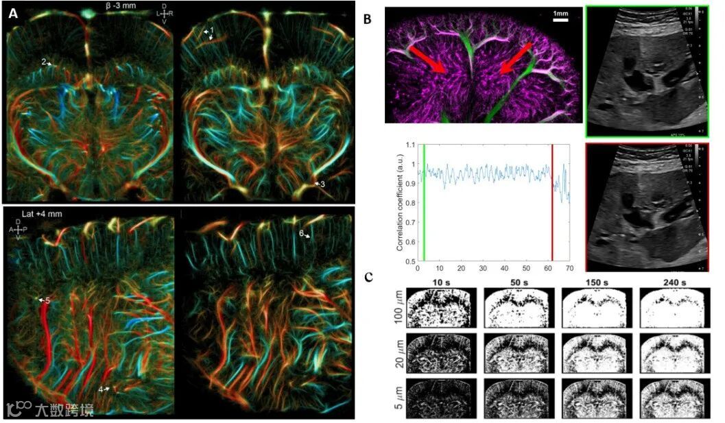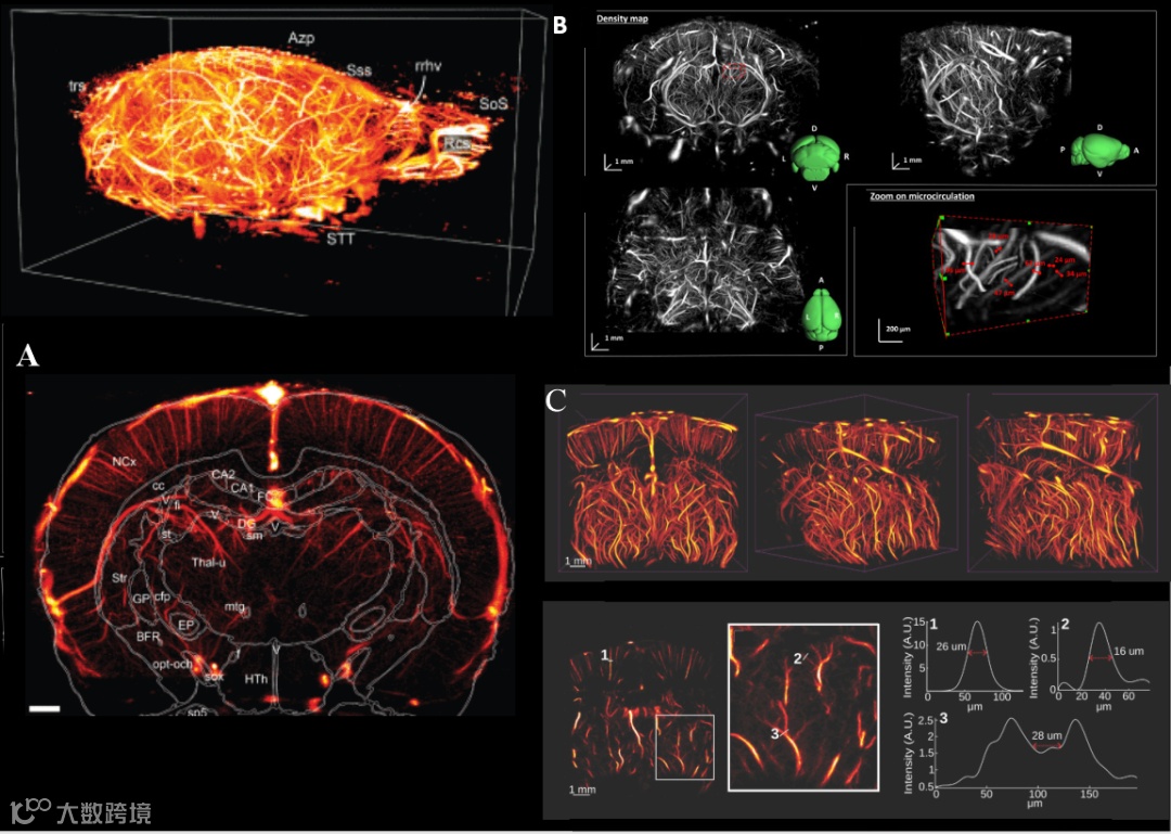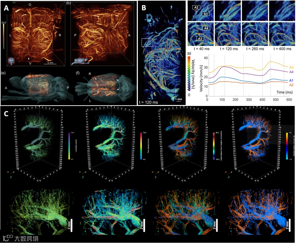 图3 体积ULM的完全寻址系统。A. 在20-30µm之间的分辨率下,可显示整个大鼠的脑血管系统[52][55]。B. 经颅小鼠脑ULM[56]。C.经颅ULM在大鼠脑中的应用[57]。