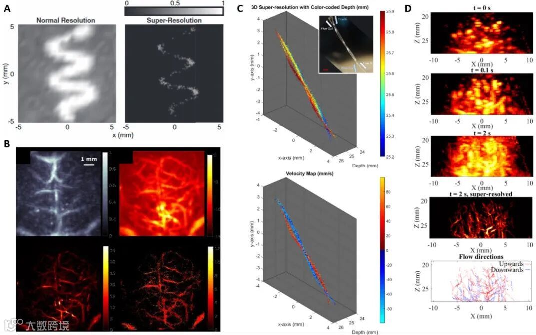 图4 容积ULM稀疏阵列系统。示范利用稀疏阵列对螺旋管仿体进行离体人体头骨的穿颅成像[48]。B. 结合光声和超分辨率成像,利用球面稀疏阵列对啮齿动物大脑几厘米深的血氧饱和度测量 [64]。C. 体外ULM稀疏阵列成像成双螺旋排列的200µm管[62];D. 猪肾脏的离体容积ULM,5 MHz中心频率自制螺旋稀疏阵列[94]。