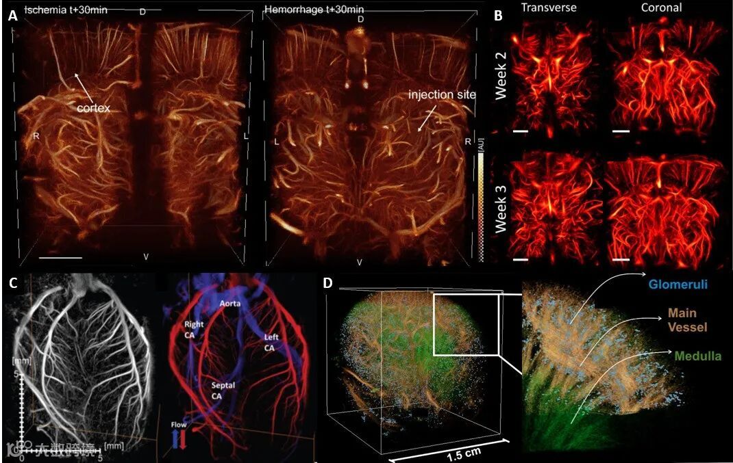 图7 所示。体积ULM的应用。A.经颅容积测定大鼠的ULM可以区分出血性和缺血性[24]。B.脑胶质母细胞瘤的纵向研究使用体积ULM在完整颅骨小鼠中进行开发(McCall 2023)。C.评估冠状动脉闭塞动力学离体心脏容积ULM (Demelanere 2022)。D.大鼠肾小球体积可视化成像(Chabouh 2024)。