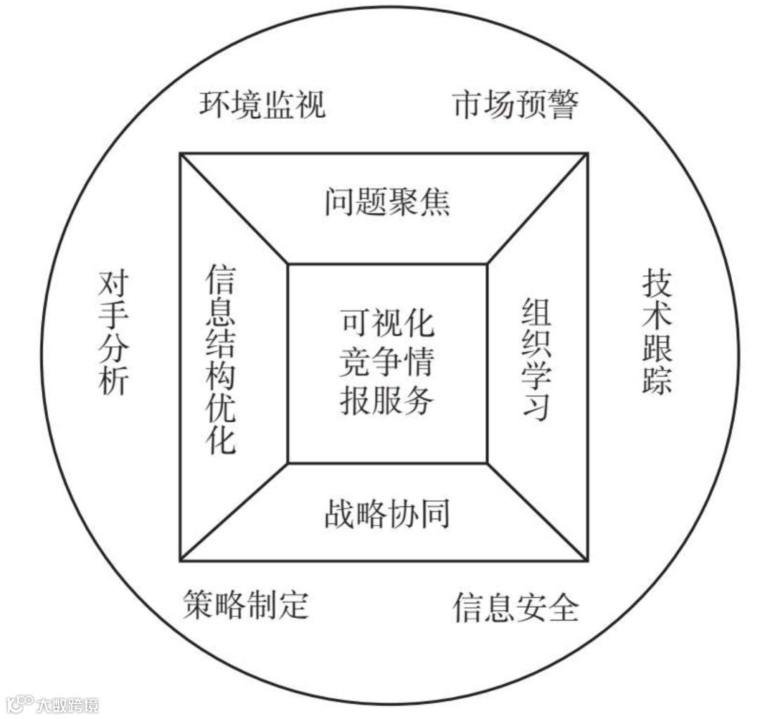 环境监视、市场预警、对手分析、技术跟踪、策略制定和信息安全是目前普遍认同的企业商业洞察所具备的六大功能。可视化商业洞察服务室是一种新的商业洞察工作运行模式,因此商业洞察的六大功能是可视化商业洞察服务必须具备的基本功能。为了更好地实现、支持这六大功能,可视化商业洞察服务还需要具备以下四种重要的功能: