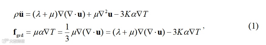 其中u为位移矢量(u为时间二次导数),μ为剪切模量,α为线性热膨胀系数,